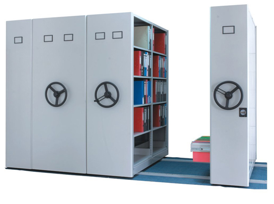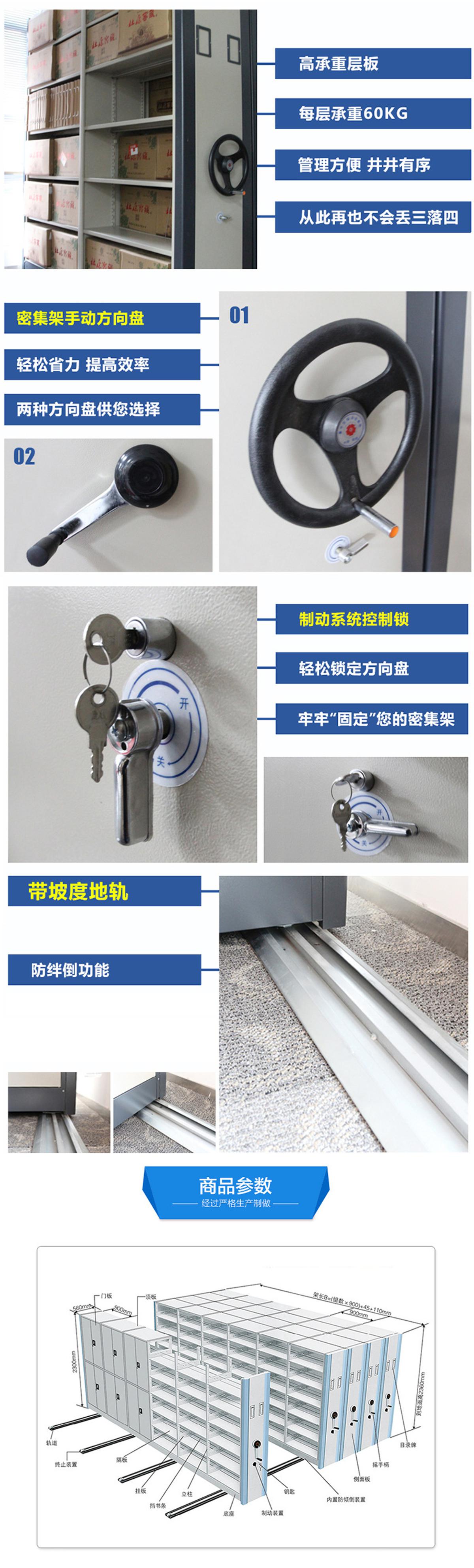 密集柜架體為箱體式結(jié)構(gòu),節(jié)與節(jié)之間有分隔板,每列中間采用6mm圓鋼,對(duì)角斜拉固定,可調(diào)整架體正斜度,搖柄采用自動(dòng)脫勾式曲柄把手。移動(dòng)輕便靈活。