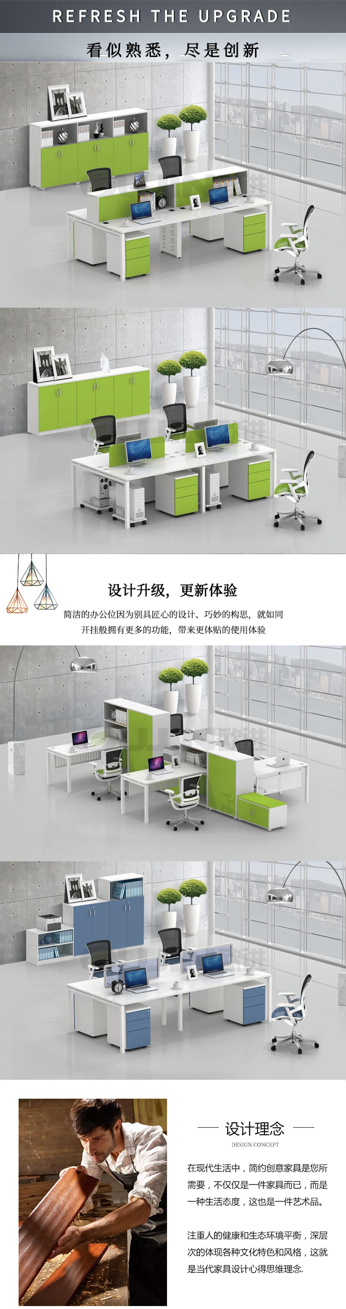 格萊美職員辦公桌擁有多種組合方式,除了單排、雙排的造型外,四人位組合,六人位組合,八人位組合,還有三人120°、四人十字形組合方式,能迎合不斷變化的辦公環(huán)境需求。120°型工作站為小團(tuán)隊(duì)協(xié)作辦公提供支持,3人位或6人位,按需求分配位置,利于同一團(tuán)隊(duì)的同事進(jìn)行互動、交流,提供工作效率。