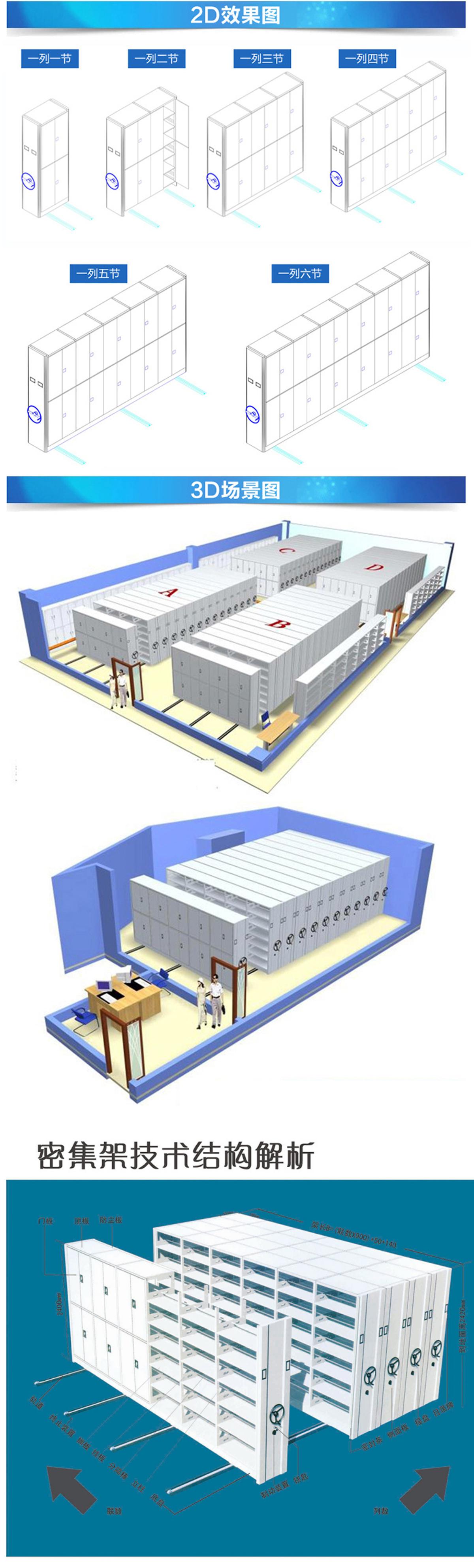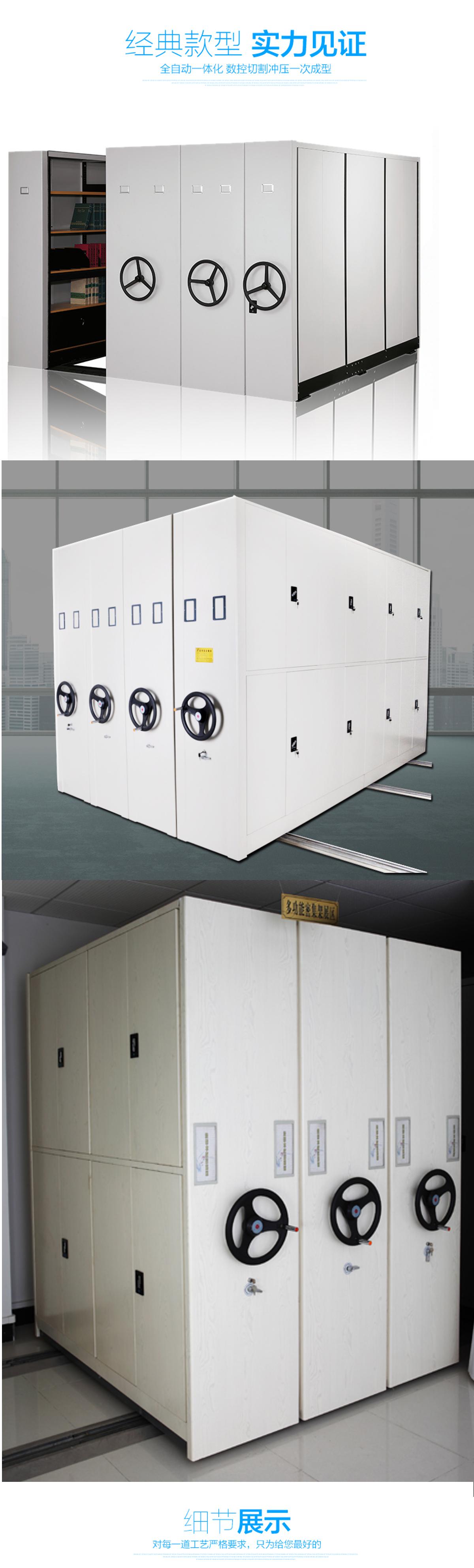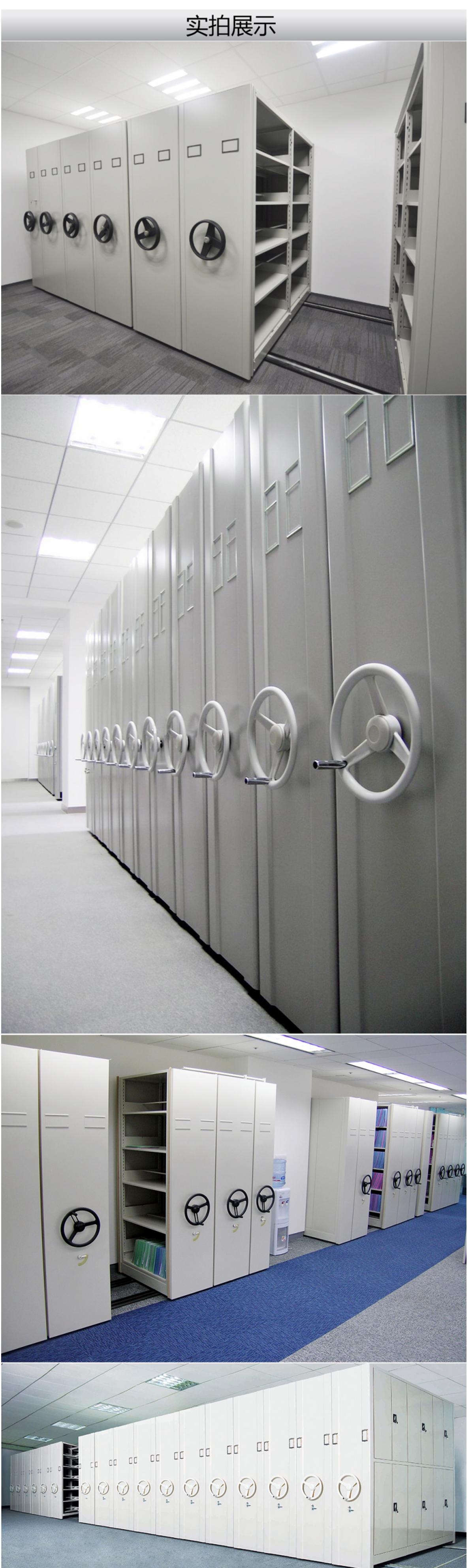 密集柜架體為箱體式結(jié)構(gòu),節(jié)與節(jié)之間有分隔板,每列中間采用6mm圓鋼,對(duì)角斜拉固定,可調(diào)整架體正斜度,搖柄采用自動(dòng)脫勾式曲柄把手。移動(dòng)輕便靈活。